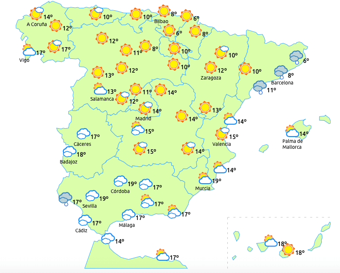 С приходом сибирского фронта тенденция к снижению дневных температур сохранится в северной и восточной частях полуострова, а также в некоторых районах северо-востока и Балеарских островов. В центре, и особенно на юге Испании, температура будет выше на 3 - 5 градусов.